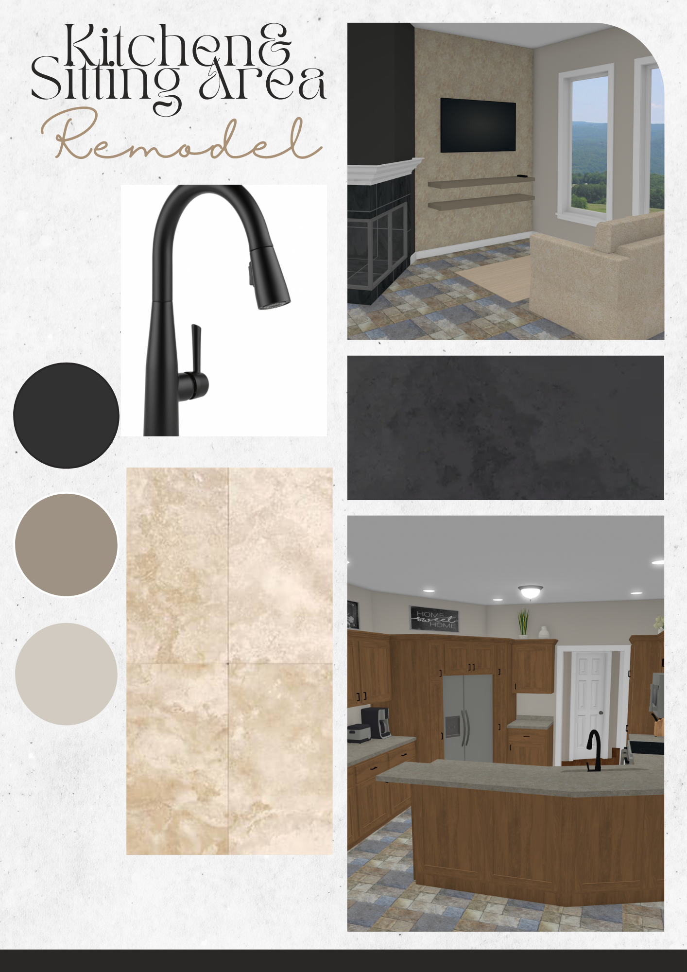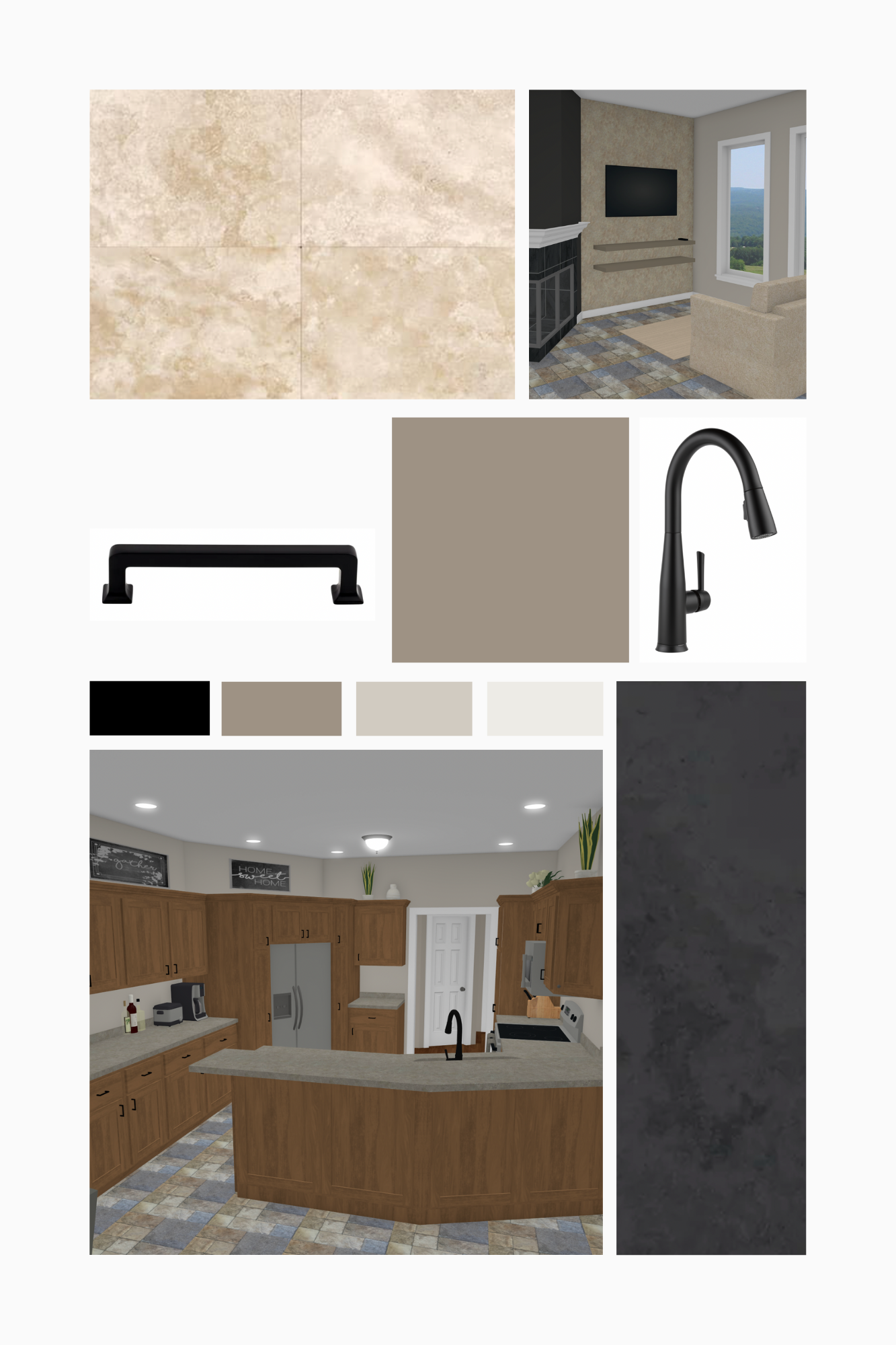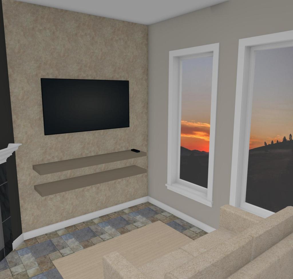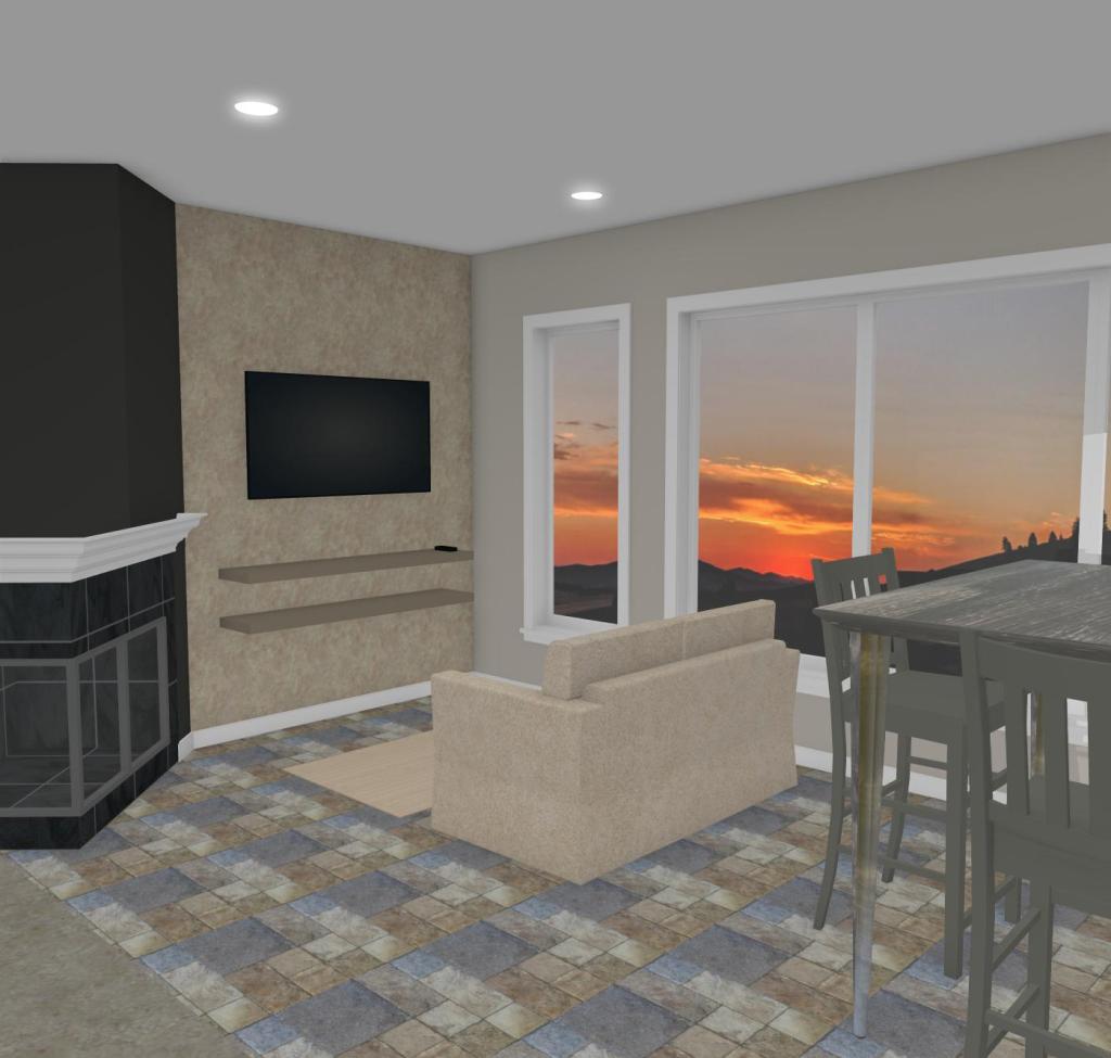 while working with this unique floor pattern, we added a travertine stone accent wall and a black tile fireplace surround