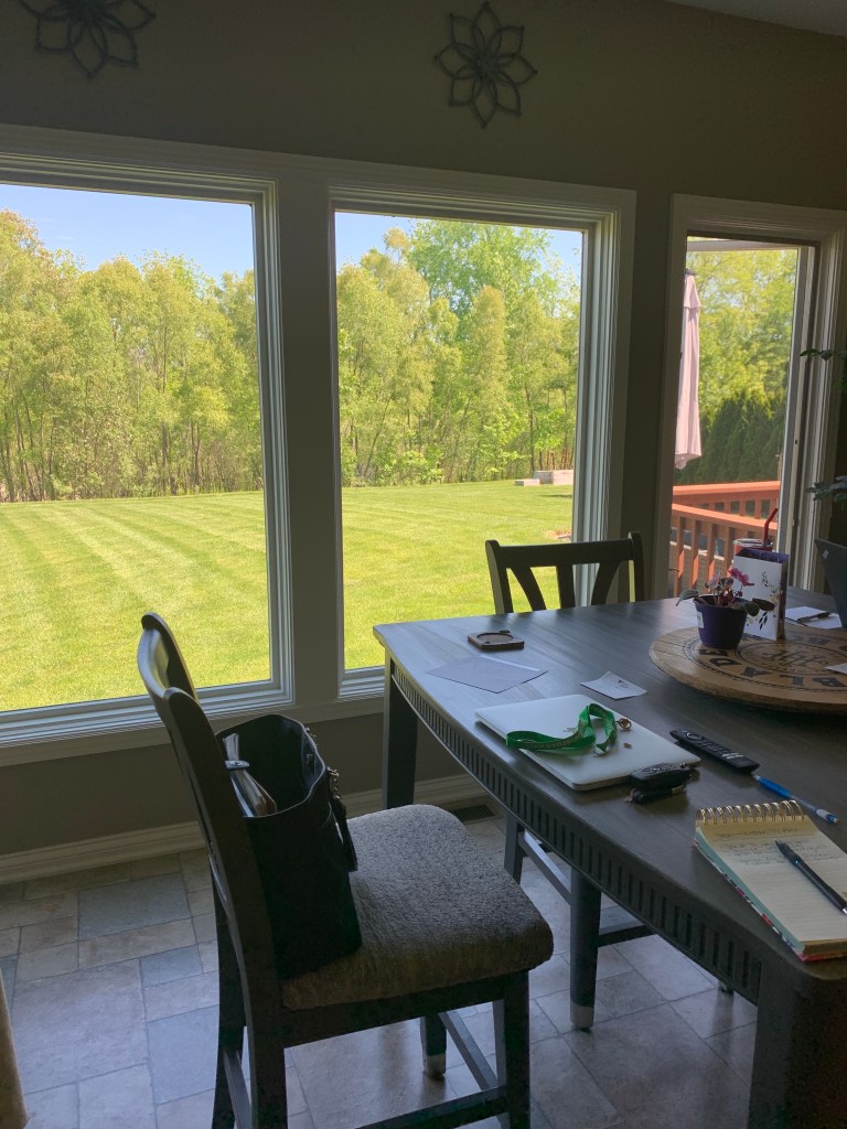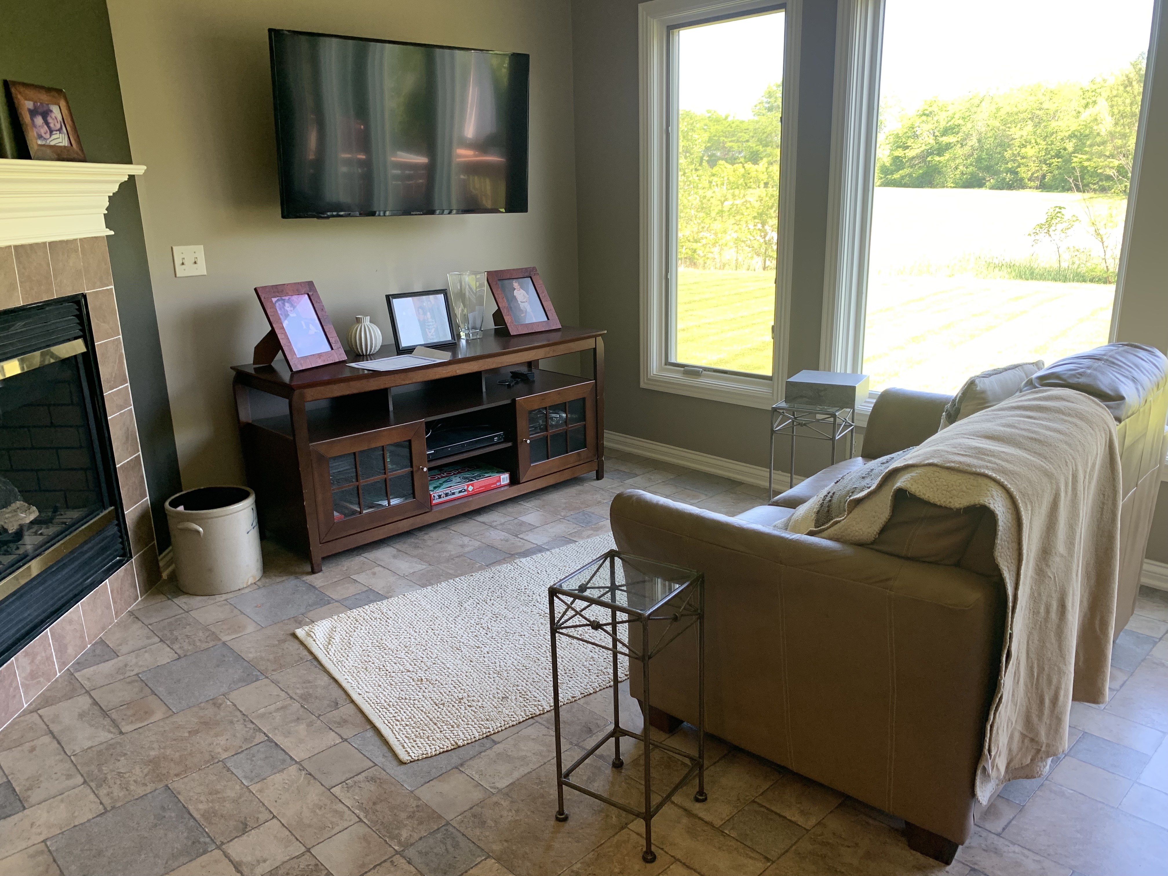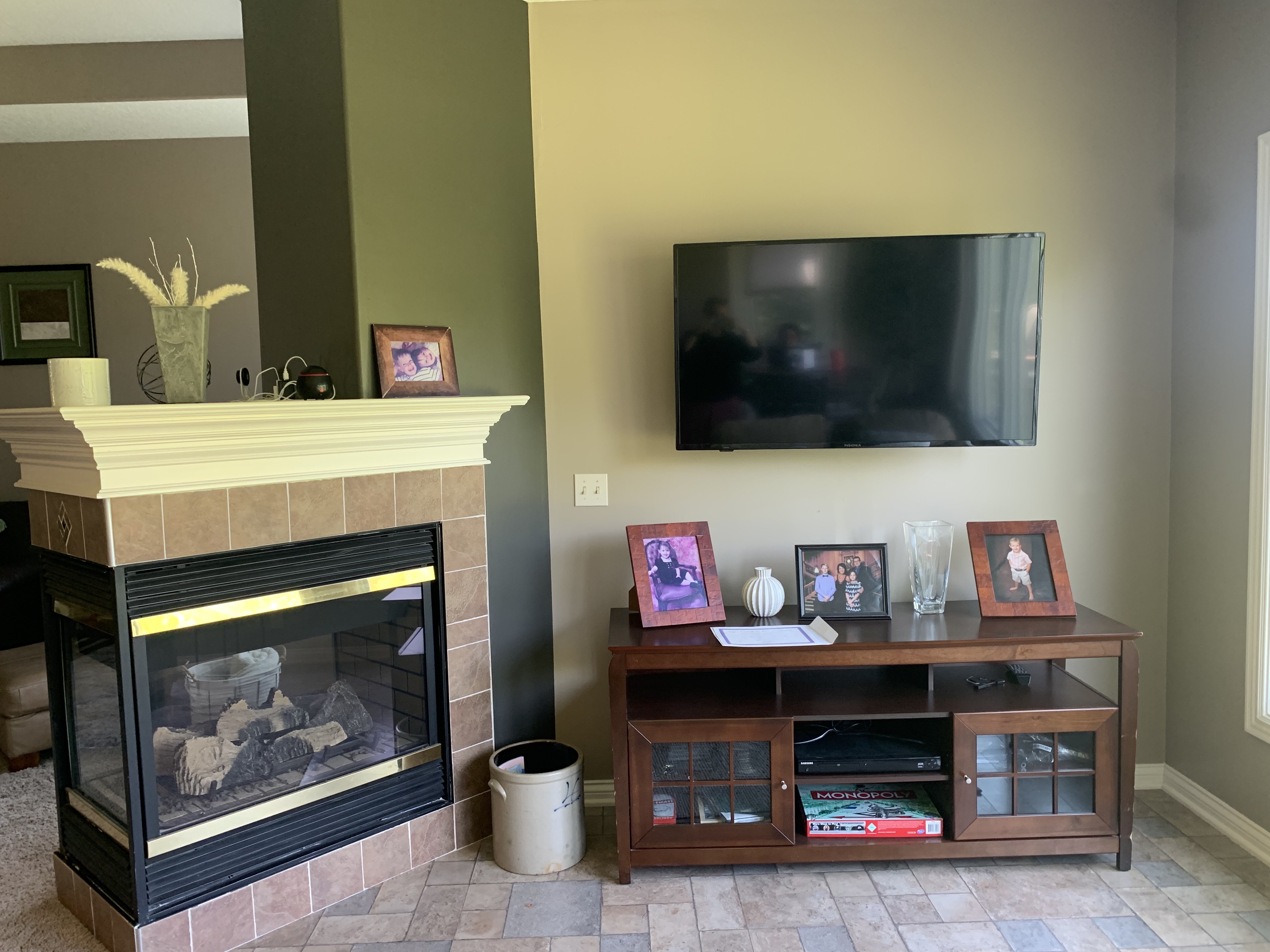 while working with this unique floor pattern, we added a travertine stone accent wall and a black tile fireplace surround