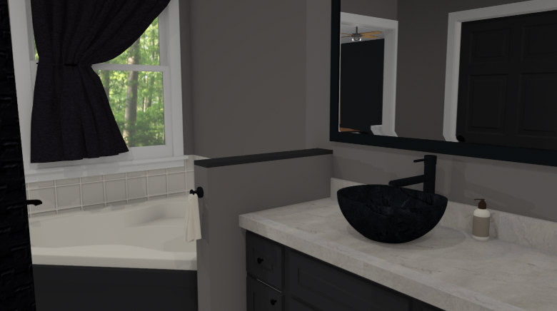 A grounded bath defined by stone textures and quiet contrast. Remodel in Progress!!